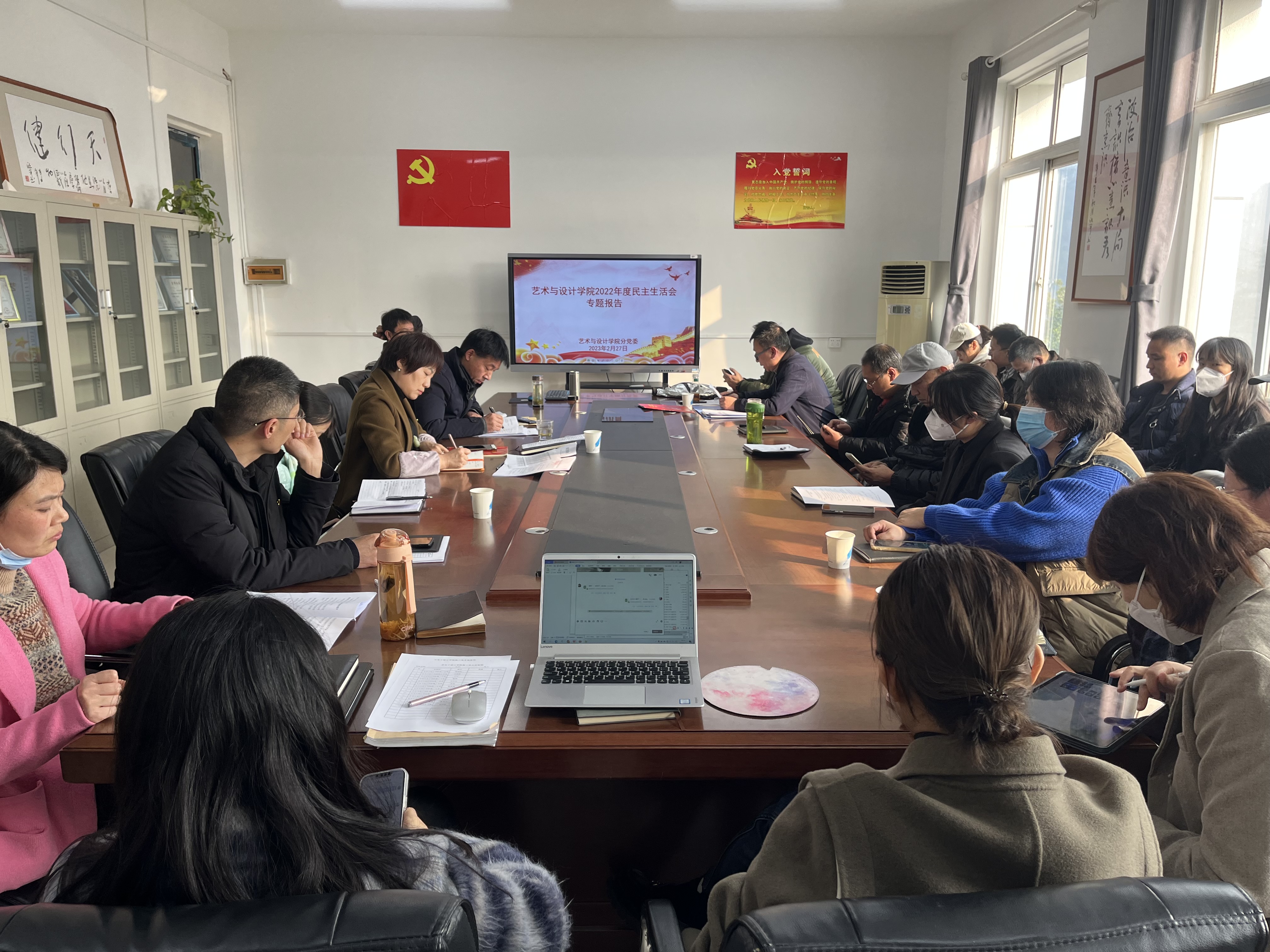 (本网讯)2月27日下午,艺术与设计学院在1419召开全体教职工大会,全院职工参会。会议由分党委副书记马晓涛主持。
