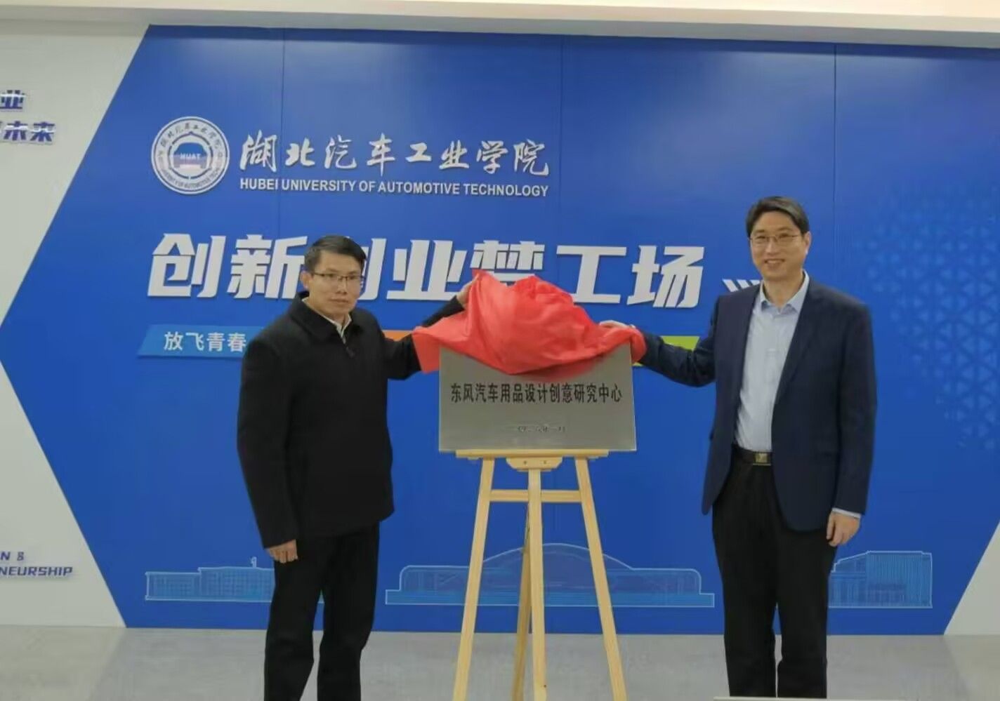 座谈会上,双方围绕重点合作方向深入交流,正式签署合作协议和横向项目委托协议,王生怀与童伟东共同为“东风汽车用品设计创意研究中心”揭牌。随后,童伟东一行参观了有爱爱