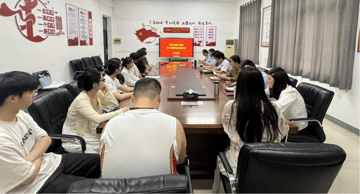 召开2024届毕业生座谈会。艺术与设计分党委书记黄进涛、副书记王新,副院长朱炜、各专业负责人、学工办教师以及毕业生代表参加座谈会。会议由副院长龚青山主持。