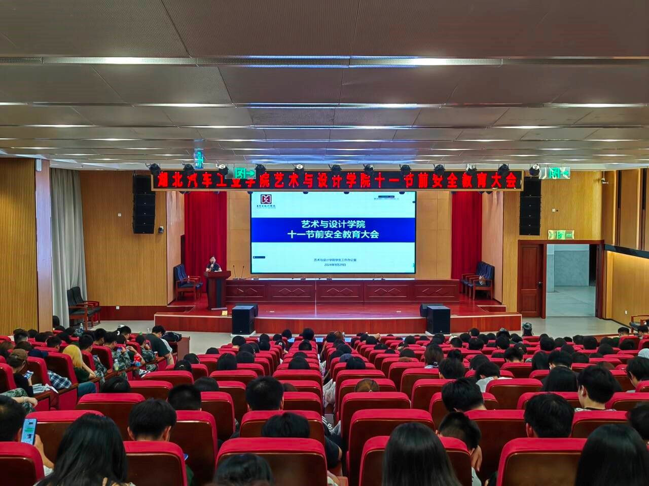 本网讯(文/图 郭慧)9月29日下午,艺术学院在产教大楼四楼报告厅召开国庆节前安全教育大会,学院分党委副书记王新、学工办主任、分团委书记董煌煌、辅导员郭慧及学院全体学生参加会议。