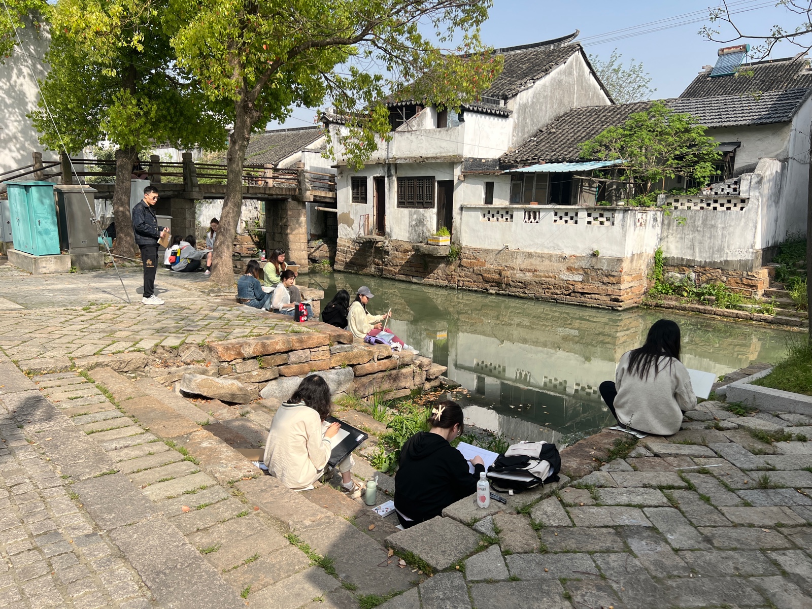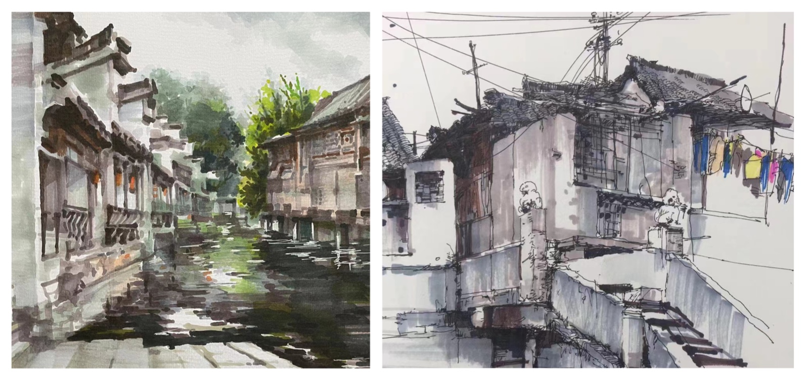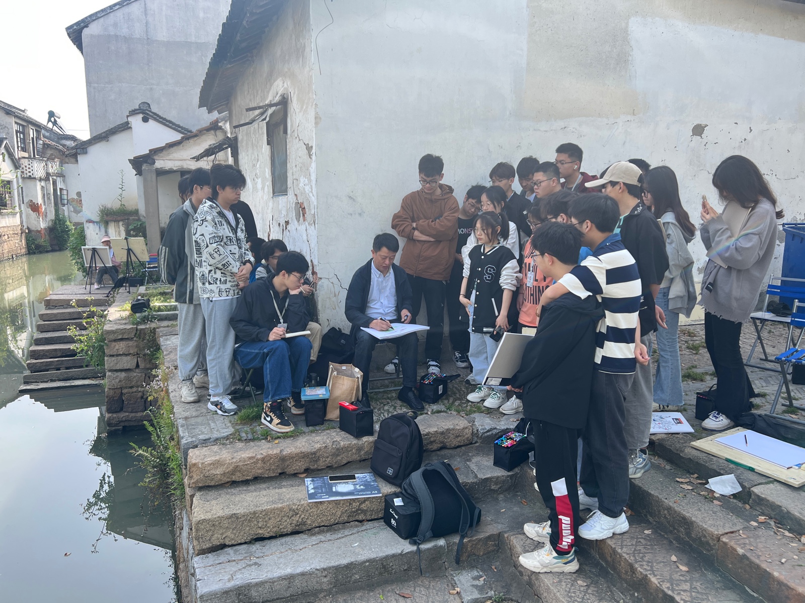 在水乡古镇甪直和南浔古镇,小桥流水、黛瓦白墙,教师与学生们流连忘返,纷纷挑选自己喜欢的景色,用画笔画出心中的热爱。教学与实践经验丰富的鞠清绘教授与谢逢春教授现场耐心为学生们示范,一笔一画看似随意,却又恰到好处。