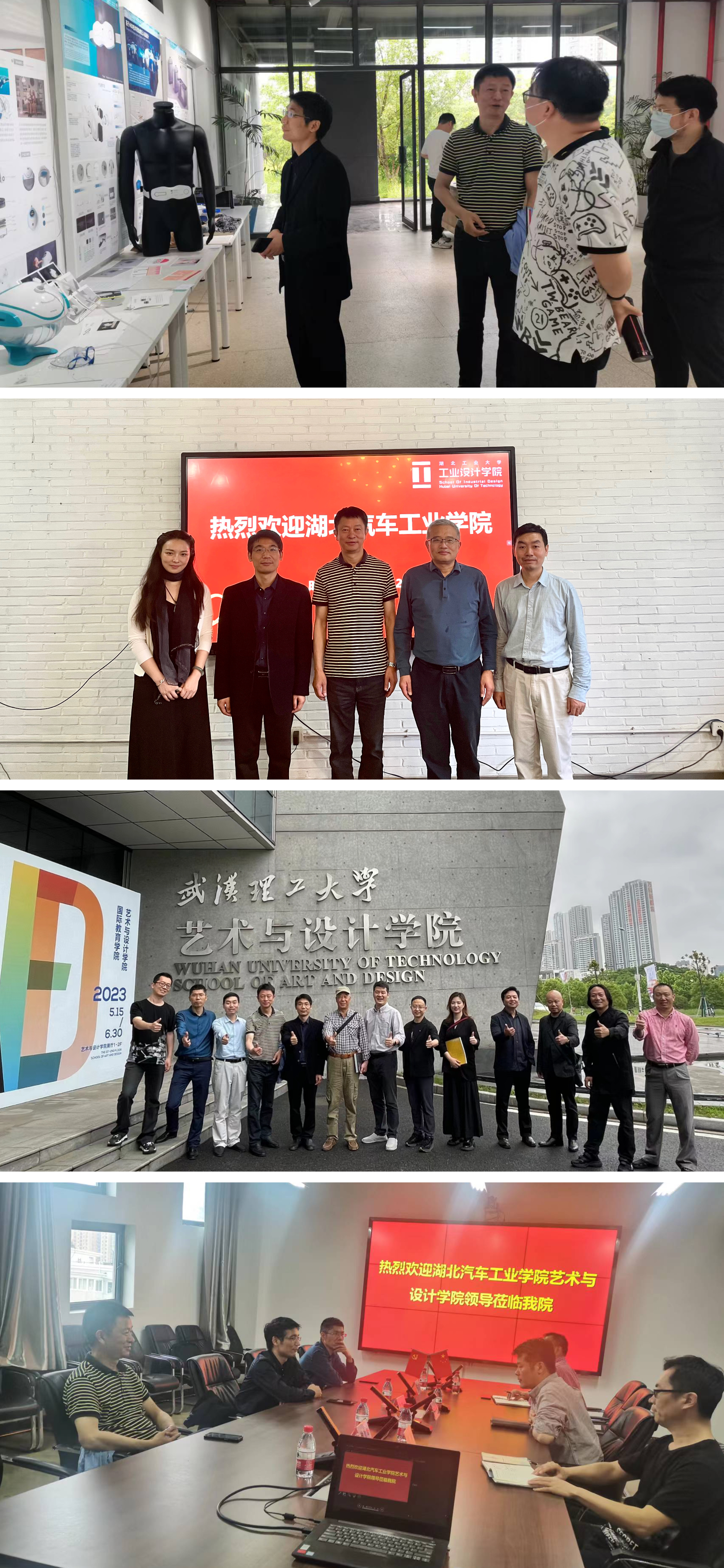 在湖北工业大学、湖北美术学院、武汉理工大学三所高校,调研组实地考察参观了工业设计专业实验室、毕业设计展等,并与兄弟院校在考研升学、一流课程申报、硕士点建设、教师访学等方面进行了深入交流与探讨。
