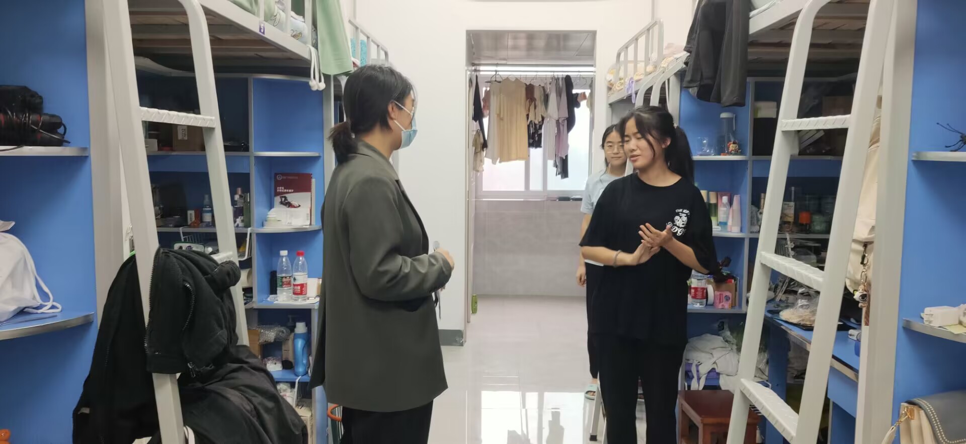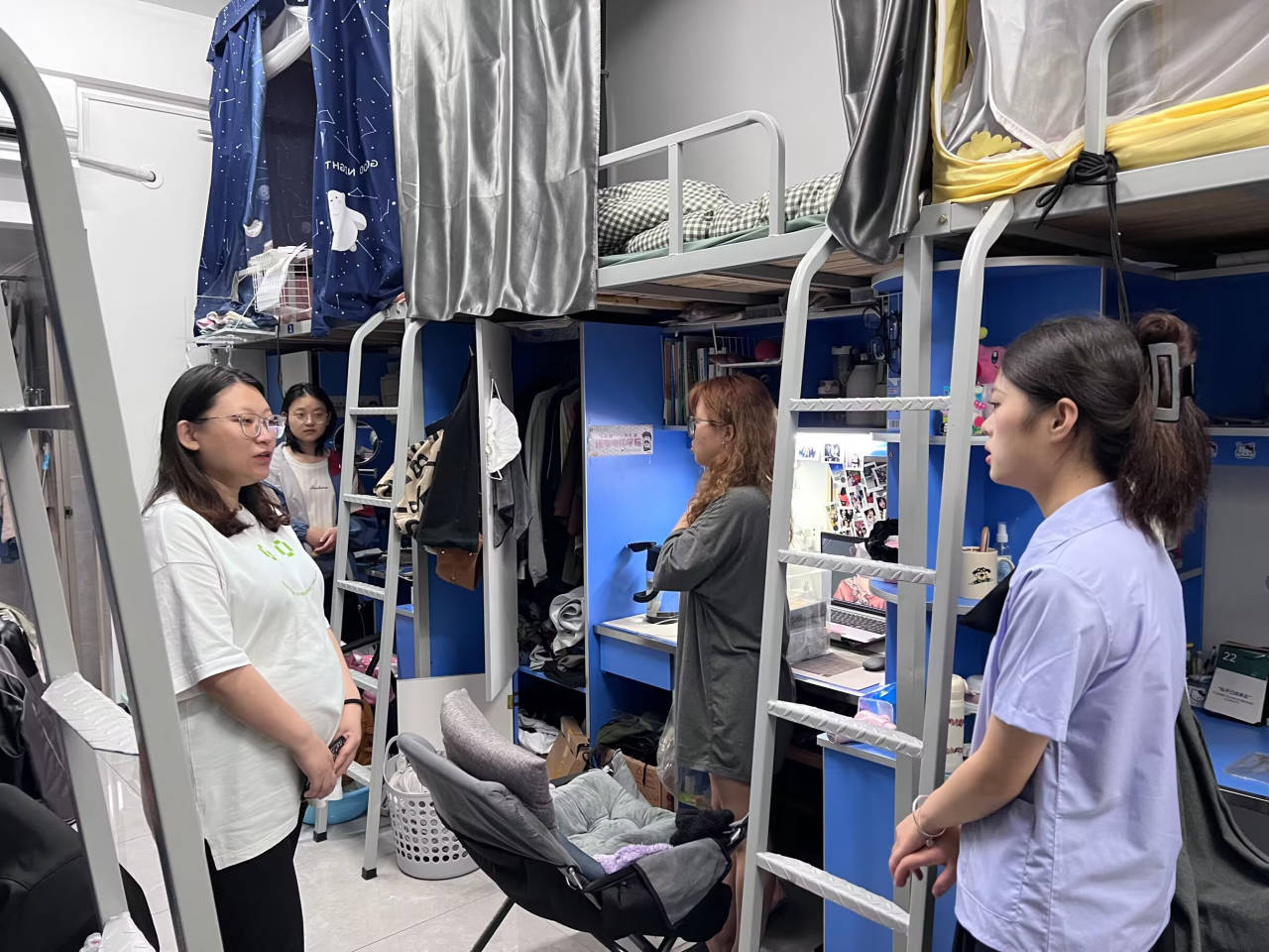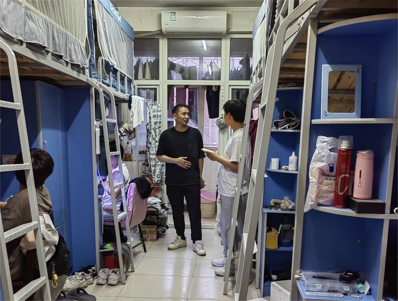 走访过程中,老师们对学生宿舍卫生和安全隐患进行了排查。王新叮嘱同学们注意安全,一是雨天路滑,注意校内外的交通安全,二是宿舍的用电安全,不要私搭乱接,三是反电诈,不参与不被骗,每个人都要做反诈卫士,四是防溺水安全。希望寝室长能够担起责任,寝室成员间互相督促、共同进步,营造良好安全的生活学习环境。老师们耐心走完艺术学院的每一间宿舍,将叮嘱和关心送到每一位同学,更为即将赴武汉产学研基地的同学们送去了慰问。同学们纷纷表示一定会遵规守纪,注意安全,共建一个健康、有序的学习生活环境。